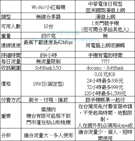 價格是一天199元,看起來很便宜對吧,但是Wi-Ho!計費是以"日期"計算,也就是說出發當天就算一天,對於下午或晚上才出發的人不利,回來也是一樣,早上回到台灣的人不利,我四月時回程是香草一大早的飛機,等我租了之後仔細算一下才覺得好像不划算……。